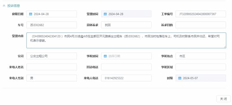 4月28日,公交出租汽車公司收到市民楊先生撥打12345政務熱線表揚工單,感謝的哥孫華興師傅拾金不昧、樂于助人。