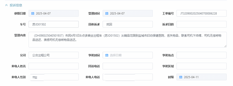 4月7日,公交出租汽車公司收到市交通運輸服務(wù)中心轉(zhuǎn)來的12345政務(wù)熱線表揚工單,感謝出租車駕駛員卞茂師傅及時歸還丟失的裝有孩子醫(yī)?、衣物和玩具的包裹。