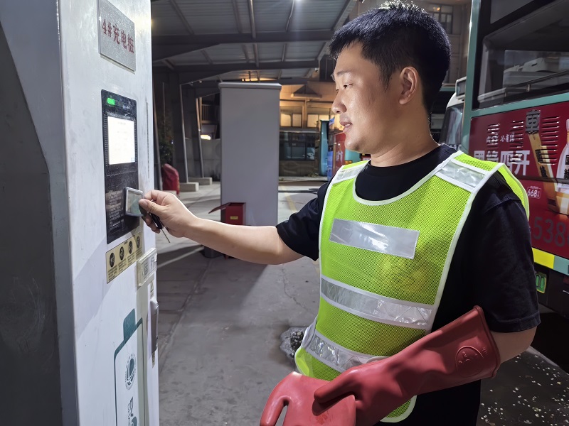 白天,他們精心維護(hù)充電樁區(qū)域衛(wèi)生,細(xì)致巡查充電設(shè)備,積極協(xié)助駕駛員高效完成補(bǔ)電任務(wù);夜晚,他們爭(zhēng)分奪秒,為“饑腸轆轆”的公交車逐一充滿電,確保它們“滿血復(fù)活”,以最佳狀態(tài)迎接次日的運(yùn)營挑戰(zhàn)。華健物流園公交樞紐的充電工張浩,便是其中之一。