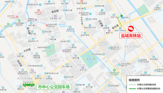 線路走向:市中心公交回車場、西環(huán)路、大慶路、鹽馬路、建軍中路、文港路、青年路、范公路、鹽城高鐵站