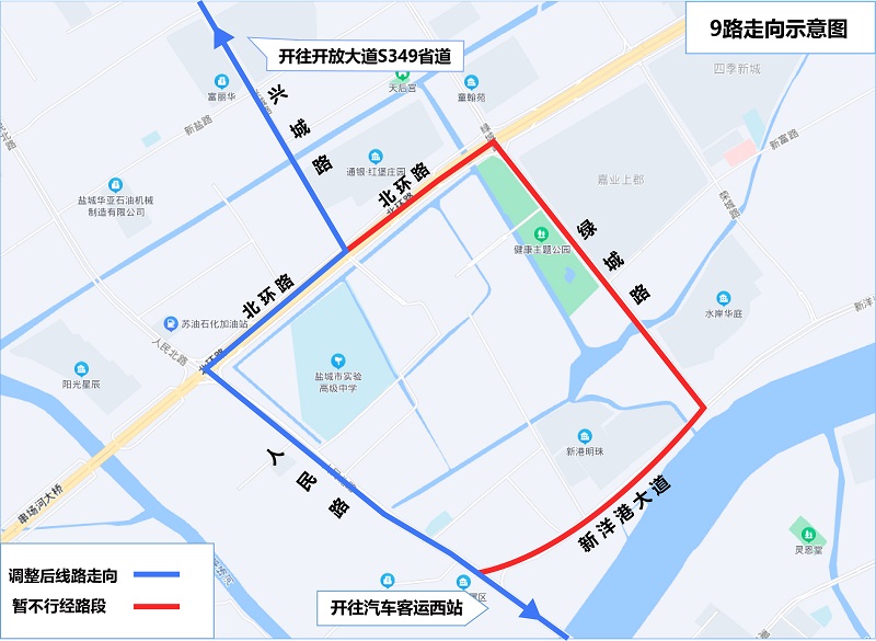 因綠城路(北環(huán)路至新洋港大道)道路施工,7月12日起,公交9路臨時改道行駛,具體如下: