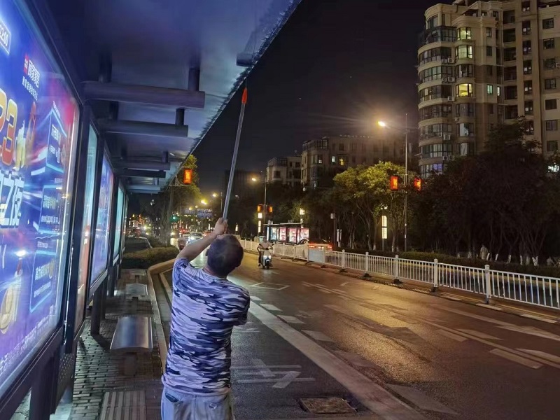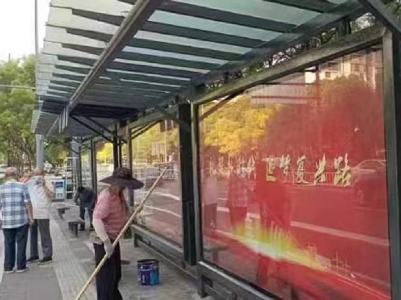 為保證除銹刷漆能達(dá)到最佳效果,工作人員先使用除銹工具將站臺(tái)表層的陳舊漆面和銹跡部位進(jìn)行清除,再用細(xì)毛刷進(jìn)行仔細(xì)清潔,接著對(duì)漆面脫落部位進(jìn)行刷涂漆面,圓滿完成“美容”工作。因時(shí)間緊、任務(wù)重,工作人員采取“白+黑”的工作模式,不畏驕陽(yáng)曝曬、不懼熱浪“烤”驗(yàn),通過(guò)連續(xù)奮戰(zhàn),僅用5天便完成了40座公交候車亭的除銹刷漆見(jiàn)新工作。