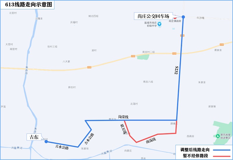 調(diào)整后走向:尚莊公交回車場、S232、崗榮線、古水公路、古東。